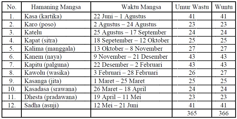 pranata mangsa tersebut sebagaimana dapat dilihat pada Tabel 1 di bawah ini :
